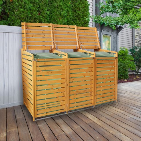 Triple Wheelie Bin Store Strong Wooden Shed Recycling Store Natural Timber Lockable Latched Hinged Firewood Garden Tools Storage FREE Fixing Kit 120cm (H) x 198cm (W) x 81cm (D) Description:Create a stylish feature of your three otherwise ordinary 240L bins with MonsterShop's beautiful, natural-looking wooden wheelie bin storage.