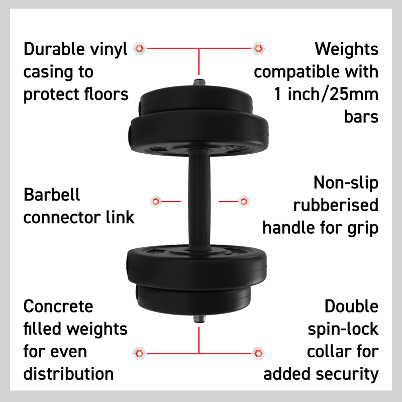 Built with stable concrete cores, these dumbbells are both reliable and durable, supporting everything from compound lifting to free-weight exercises. The set is compatible with 1-inch/25mm bars and includes weight plates, 2 barbells, 4 spin-lock collars, and a barbell link, providing everything you need to begin your fitness journey.